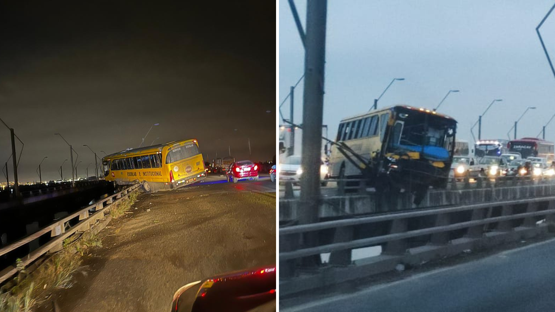 Un bus de transporte escolar se accidentó la madrugada de este lunes, 22 de mayo de 2023, en el Puente de la Puente de la Unidad Nacional sentido Durán – La Puntilla.