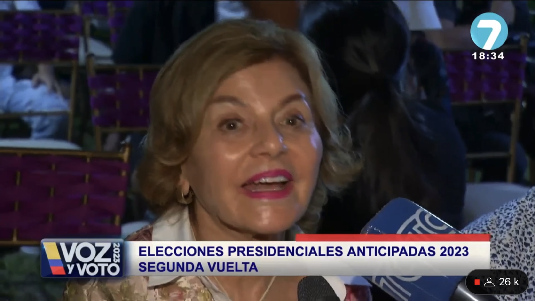 La empresaria Isabel Noboa Pontón, tía del candidato presidencial Daniel Noboa, se pronunció y pidió esperar los resultados electorales. «Yo creo que si le dan el resultado a mi sobrino, tenemos una esperanza». Isabel Noboa aclaró que ella no es política, sin embargo, aseguró que estará allí para apoyar al Ecuador «que siempre ha amado».