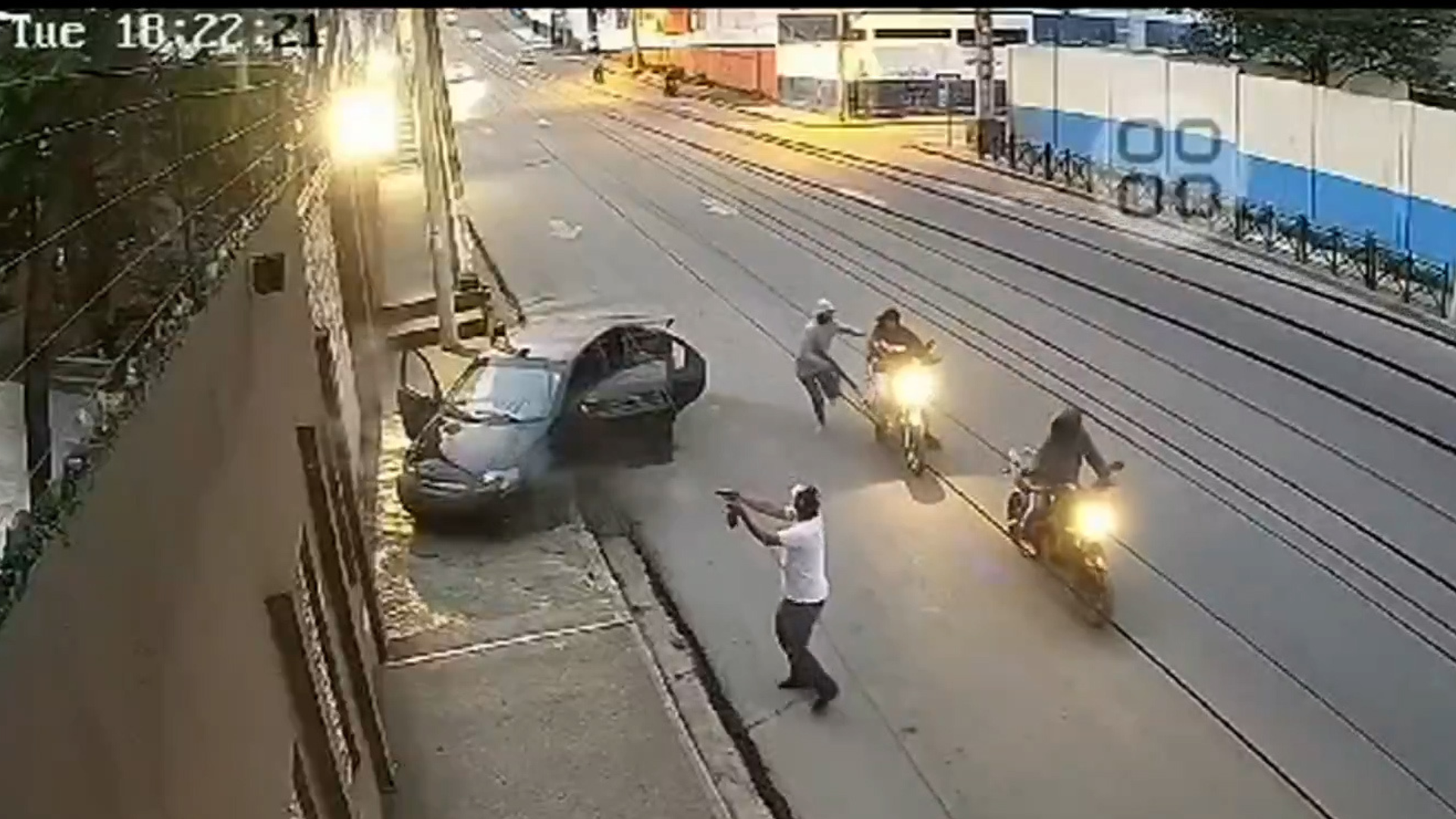 En videos de seguridad se observa a sujetos bajándose de un auto para disparar al inmueble y luego huir en motocicletas abandonando el carro que segundos después detona.