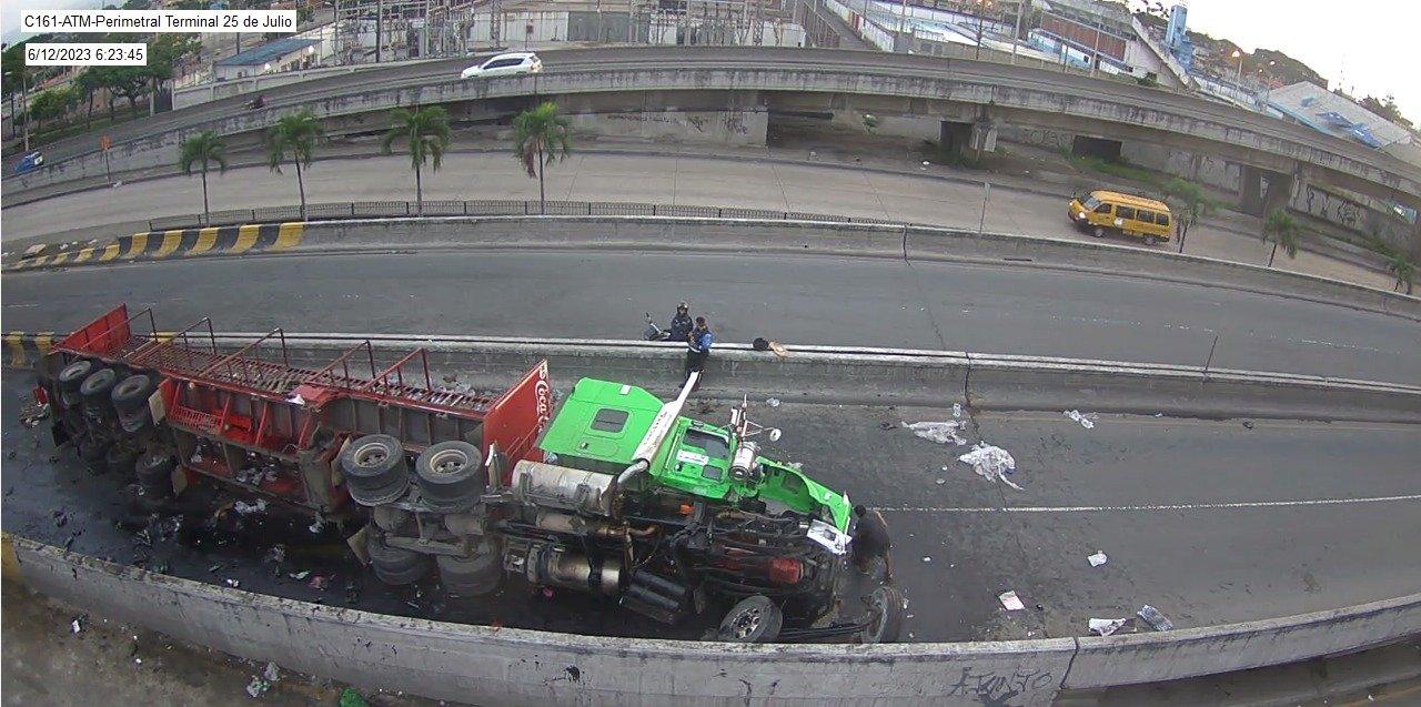 En sur de Guayaquil, desde las 19h42 del domingo 11 de Junio 2023, continúa el tráiler volcado en la Av. Pío Jaramillo Alvarado, antes de llegar a la 25 de Julio.