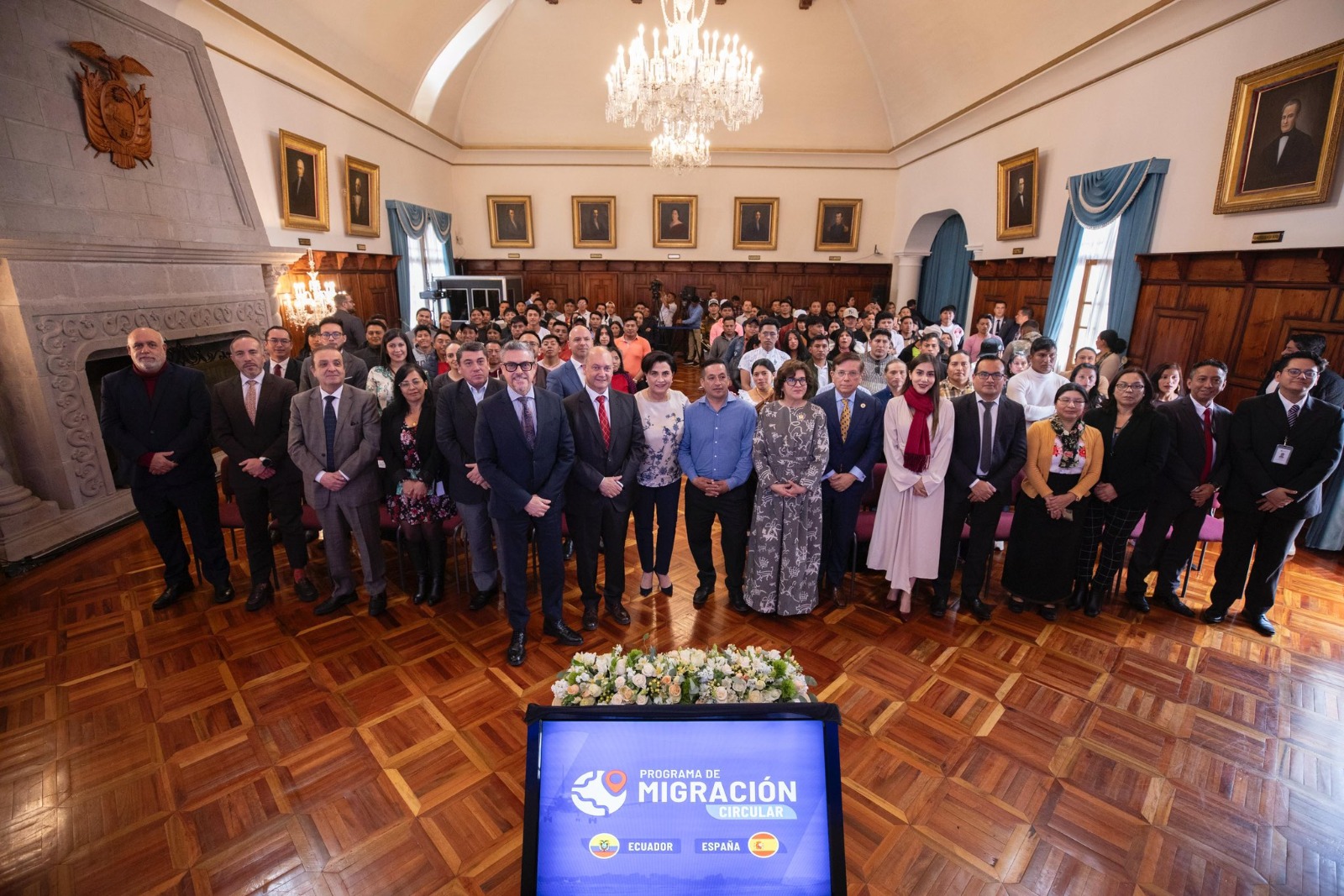 La ministra de Relaciones Exteriores y Movilidad Humana, Gabriela Sommerfeld, presidió el acto de oficialización del convenio y destacó que el programa no solo impulsa el desarrollo personal y profesional de los ecuatorianos, sino que también fortalece los lazos bilaterales entre Ecuador y España. “Esta es una vía efectiva para dar esperanza y evitar que más jóvenes se vean forzados a migrar de forma insegura”, afirmó.