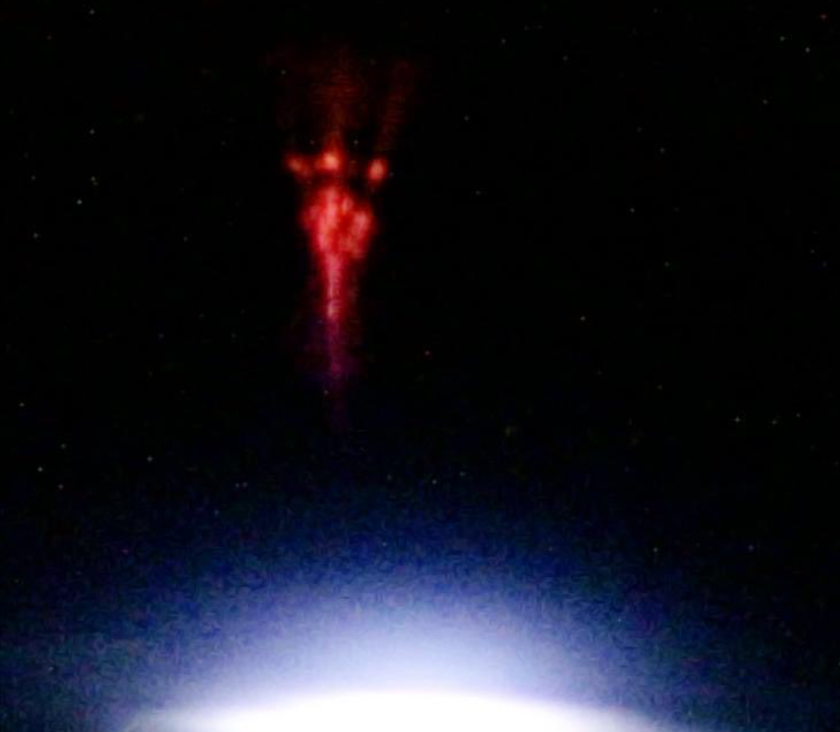Esta fotografía de un espectro rojo flotando en el espacio fue realizada desde la Estación Espacial Internacional. Se trata de eventos de descargas eléctricas a gran escala que se proyectan hacia arriba desde las cimas de las nubes en la mesosfera terrestre, a una altitud aproximada de 50-90 km.