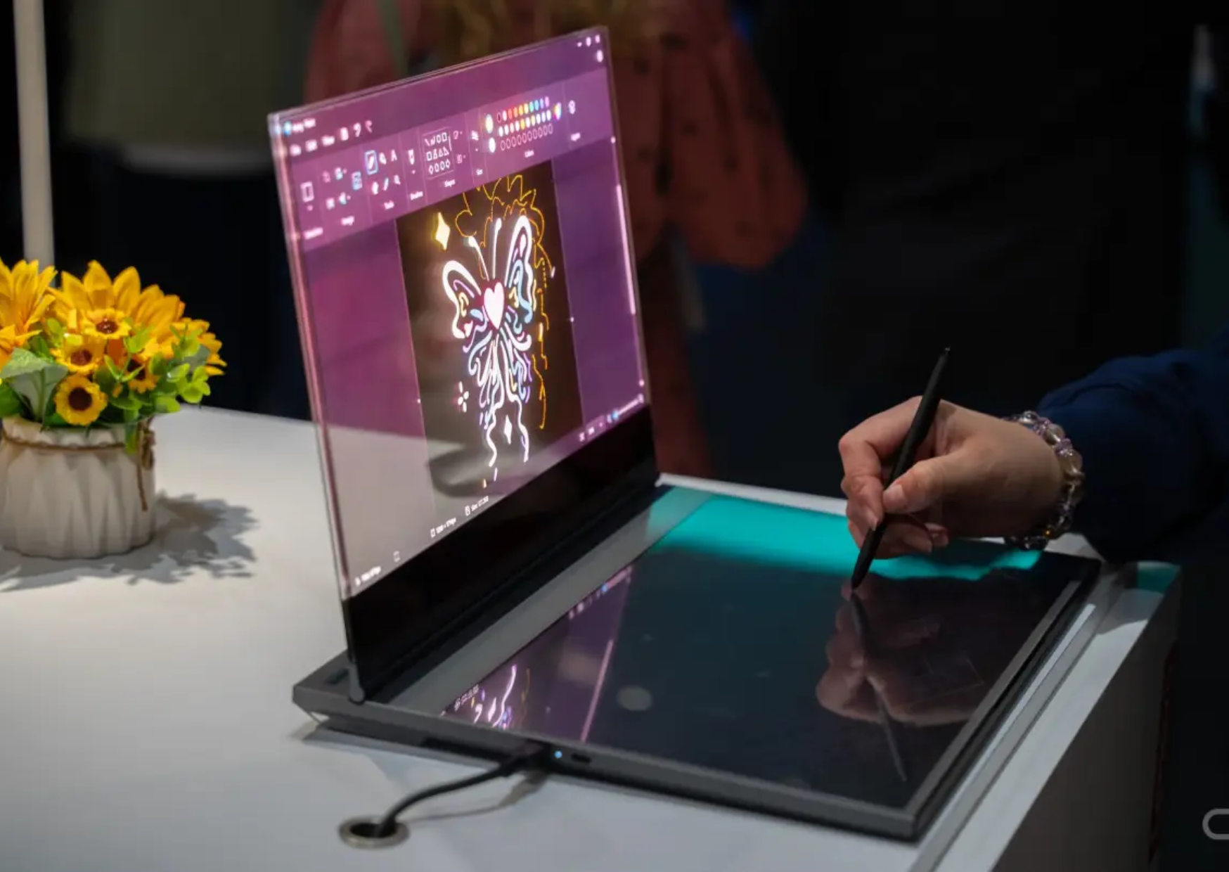 El representante que dirigió una demostración, colocó un girasol artificial detrás de la pantalla. La cámara integrada en la computadora portátil pudo identificar el objeto como un girasol y luego proporcionar información sobre él, utilizando tecnología de inteligencia artificial.