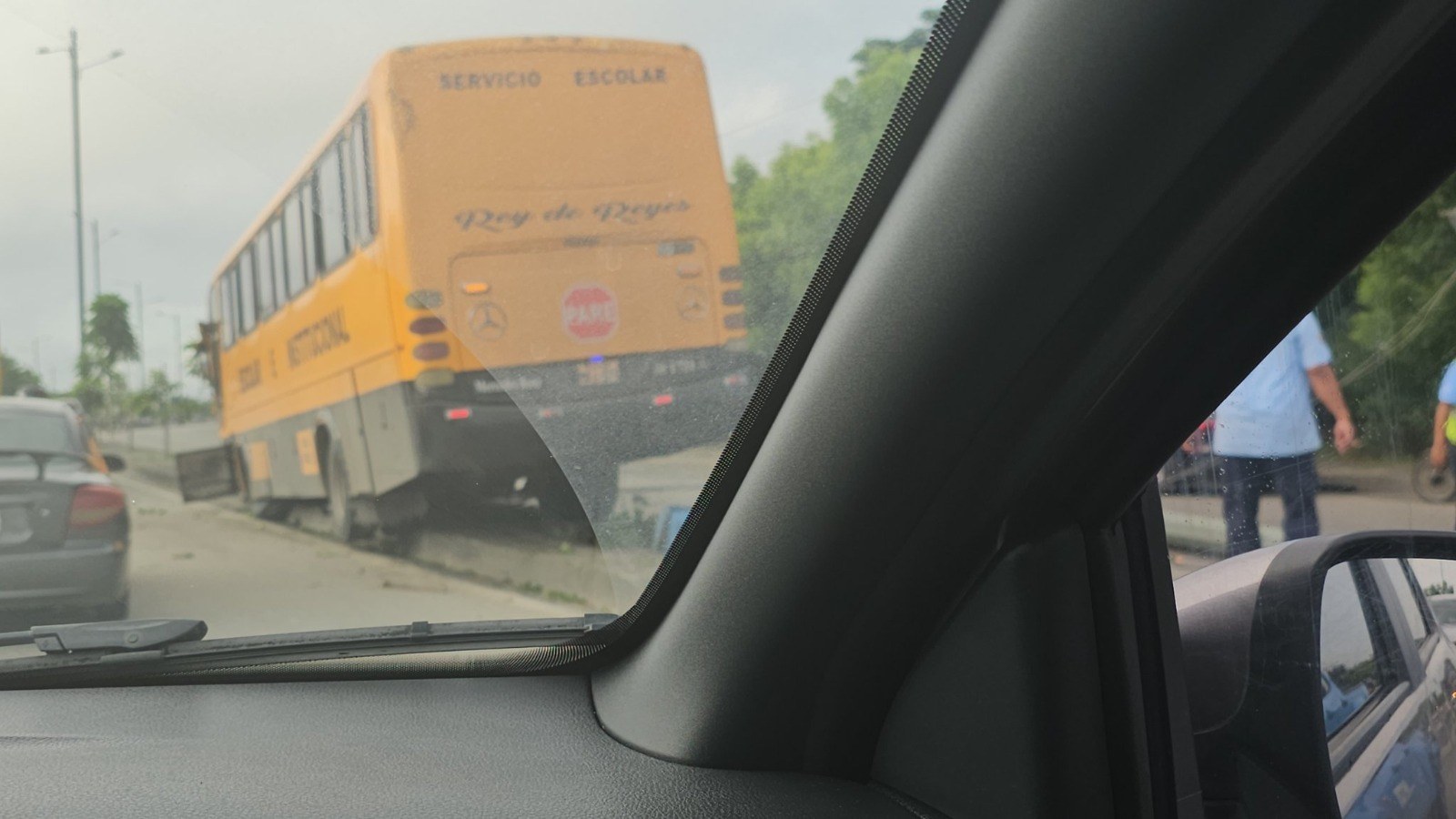 Expreso escolar involucrado en accidente de tránsito en la Autopista Narcisa de Jesús. Existe congestión vehícular debido a la caída de un poste eléctrico en el carril de servicio.