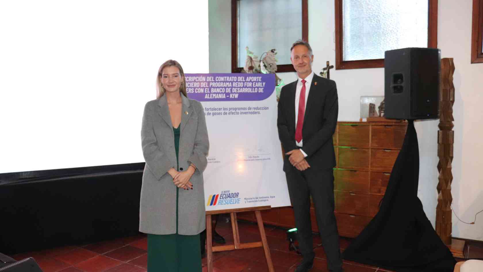 La ministra del Ambiente, Agua y Transición Ecológica (MAATE), Sade Fritschi, y el gerente Regional para América Latina del Banco de Desarrollo de Alemania (KfW), Felix Klauda, firmaron este lunes 1 de julio de 2024 el contrato de aporte financiero no reembolsable para el Programa REM II y REM III.