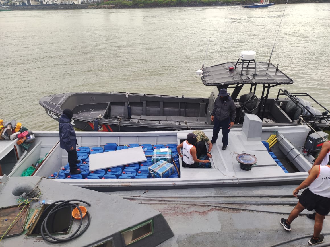 A unas 25 millas náuticas de la costa de Esmeraldas, las Fuerzas Armadas interceptaron una embarcación con tres individuos a bordo. En su interior, se encontraba aproximadamente una tonelada de sustancias sujetas a fiscalización y 918 litros de combustible.