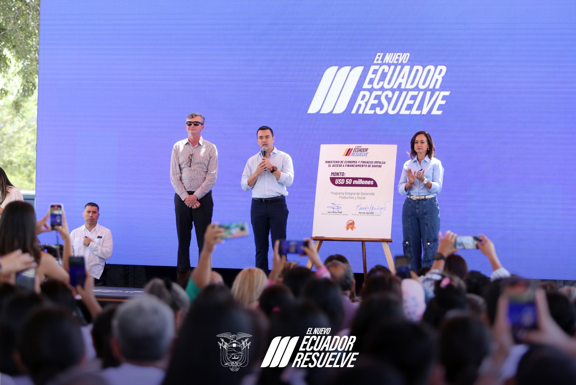 Este lunes, 22 de junio del 2024, en el cantón Milagro, el Presidente de la República, Daniel Noboa, entregó la garantía soberana para el Programa Integral de Desarrollo Productivo y Social del Guayas, destinado a tres sectores: riego, conectividad vial y productividad.