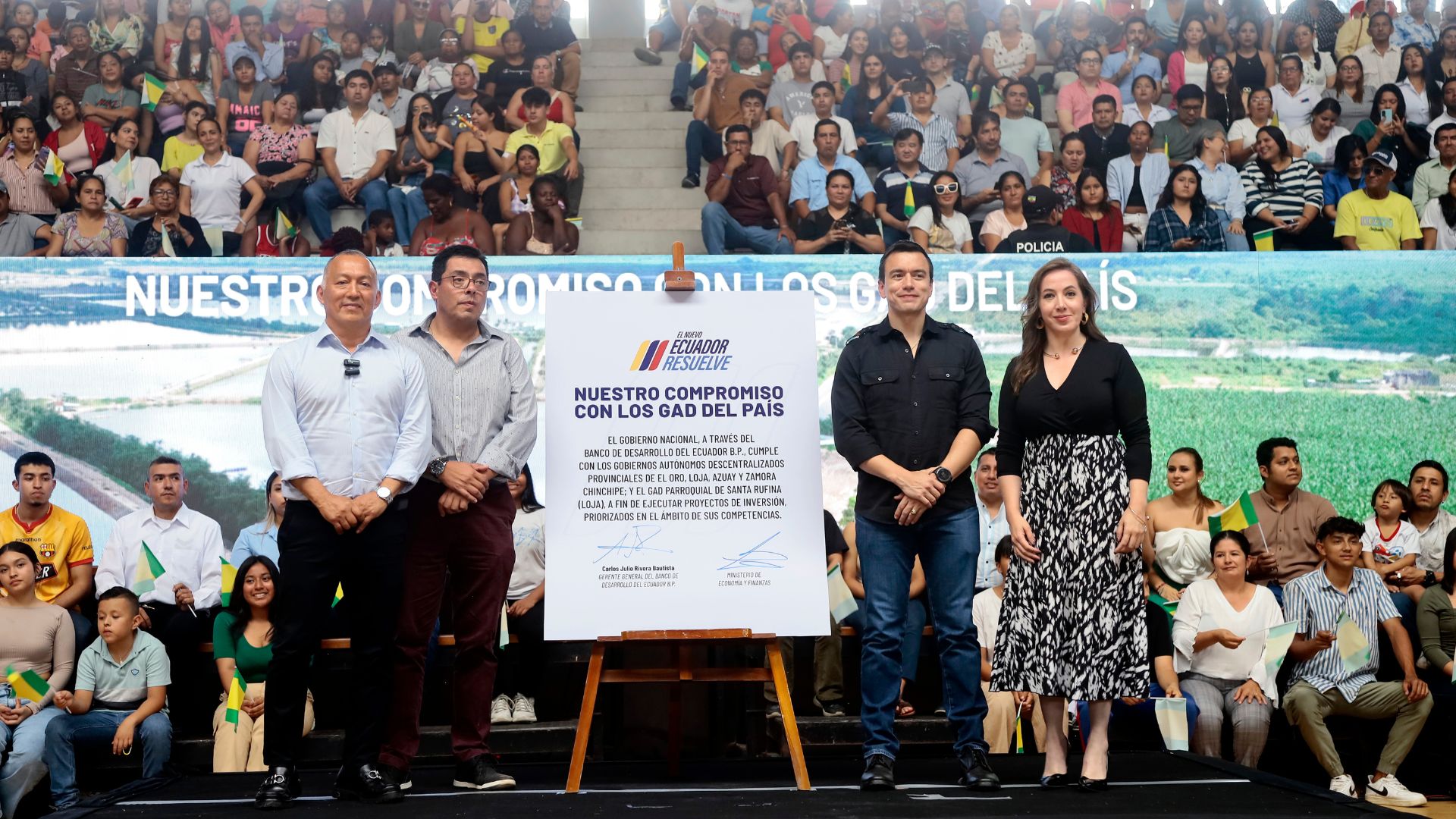 En un acto realizado en el Coliseo Polideportivo de Machala, el Presidente Daniel Noboa anunció la transferencia de USD 3.1 millones a los Gobiernos Autónomos Descentralizados (GAD) de El Oro, Loja, Azuay, Zamora Chinchipe, y a la parroquia Santa Rufina del cantón Chaguarpamba, en Loja. Este aporte, canalizado a través del Banco de Desarrollo del Ecuador (BDE), busca financiar obras clave que beneficien a miles de habitantes.