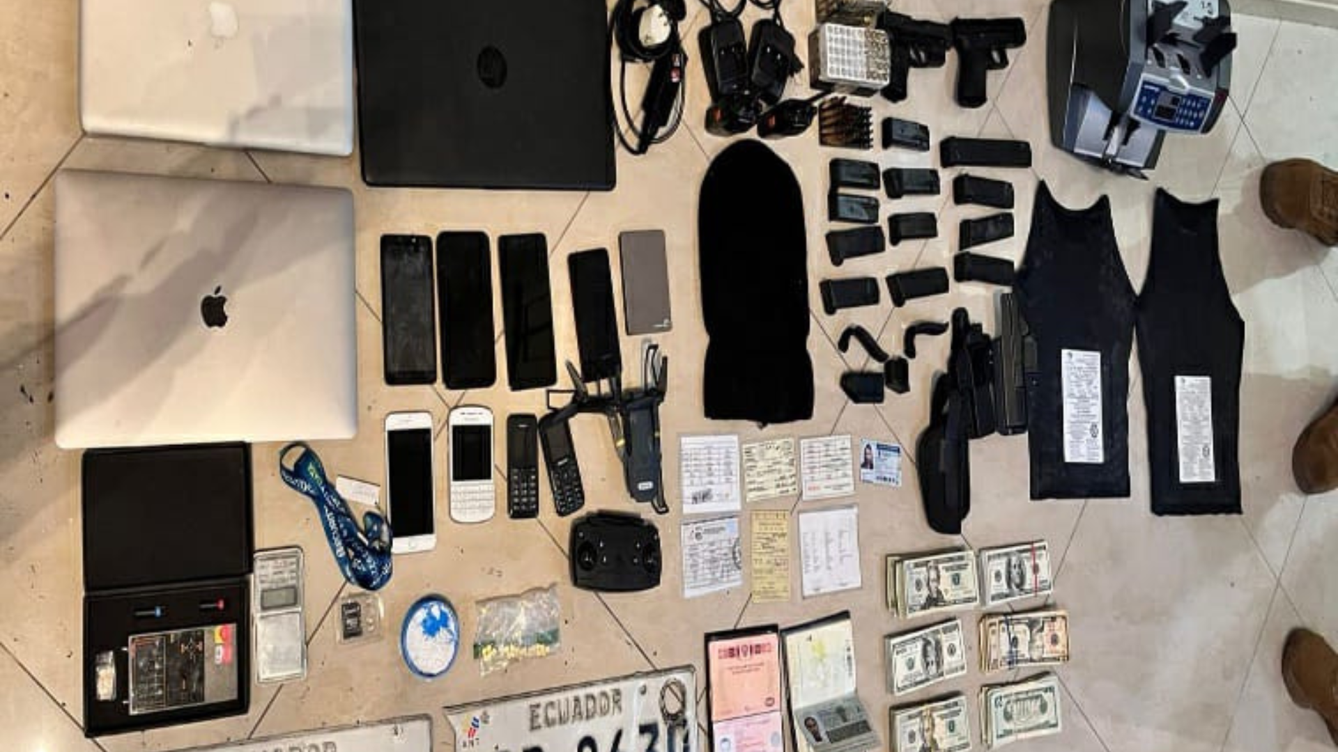 Entre los objetos confiscados se encuentran 200 municiones, 12 alimentadoras, 2 pistolas Glock, 3 fundas de pistola, 2 cajas de pistola Glock y un cuchillo. Además, se hallaron dispositivos electrónicos como computadoras y teléfonos celulares, así como documentos de identidad, pasaportes, licencias de conducir y placas vehiculares.