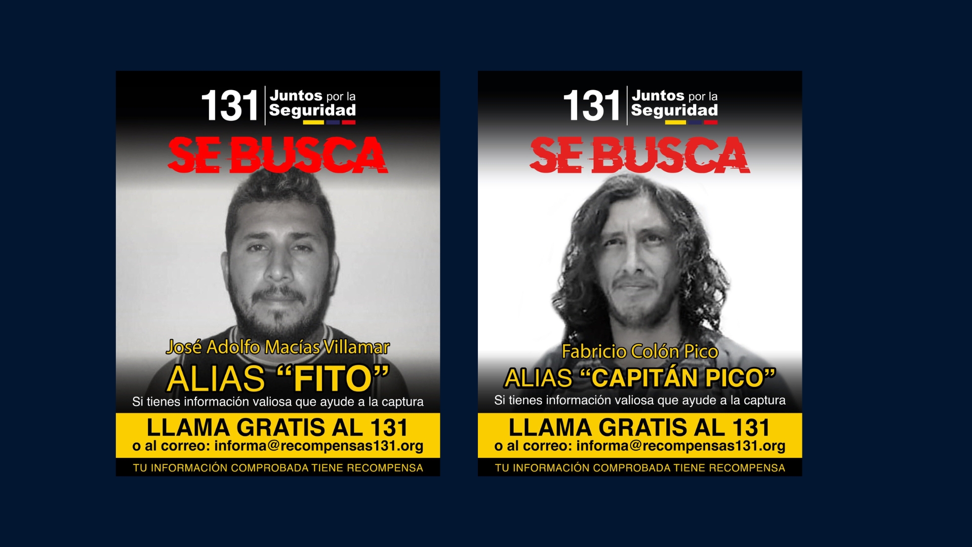 El Programa 131 ofrece recompensas a cambio de información para hallar a Adolfo Macías, alias ‘Fito’, cabecilla de Los Choneros, y Fabricio Colón Pico, cabecilla de Los Lobos.