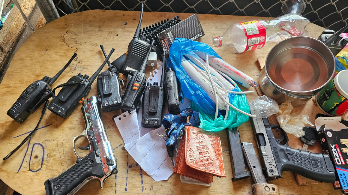 Durante el registro del lugar, se descubrió un arsenal oculto que incluía armas de fuego, municiones, drogas y, alarmantemente, dinamita.