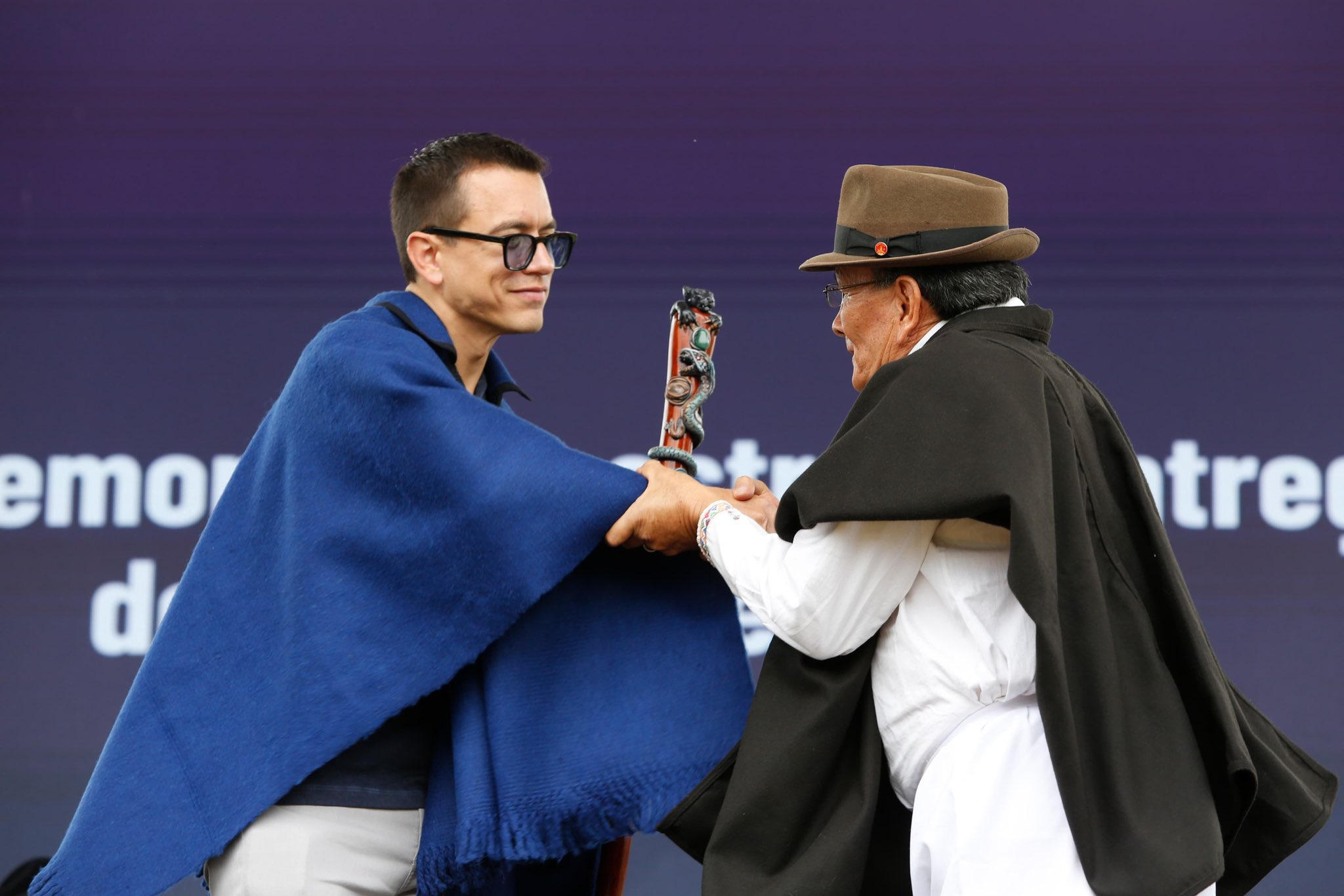 El jefe de estado ecuatoriano, Daniel Noboa Azin, fue parte de un ritual tradicional de investidura en el que líderes de las 14 etnias y comunidades nacionales de Ecuador, incluyendo representantes afroecuatorianos y montubios, le otorgaron el símbolo de autoridad, el bastón de mando.