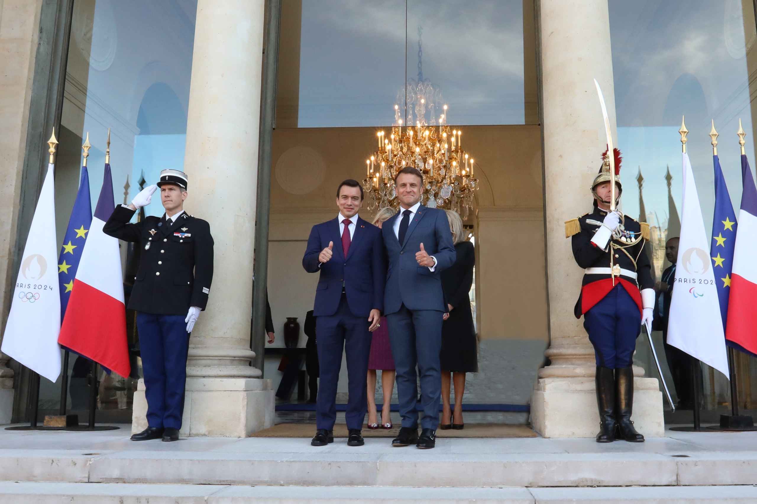 Macron y su esposa, Brigitte, recibieron al Presidente Noboa y a su esposa, Lavinia Valbonesi, en el Palacio del Elíseo, sede de la presidencia francesa.
