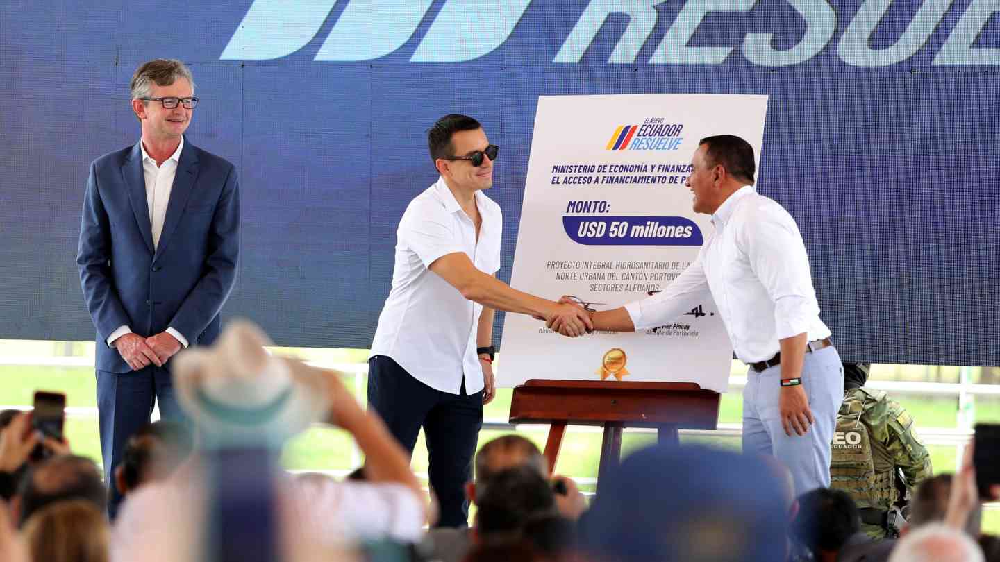 Este miércoles 10 de julio de 2024, el Presidente Daniel Noboa otorgó un aval financiero de USD 50 millones para la red hídrica de Portoviejo, Manabí. Este importante proyecto, gestionado a través del Banco de Desarrollo de América Latina (CAF), garantizará un suministro de agua potable y alcantarillado pluvial para cerca de 60.000 habitantes de la zona norte de Portoviejo y sectores aledaños.