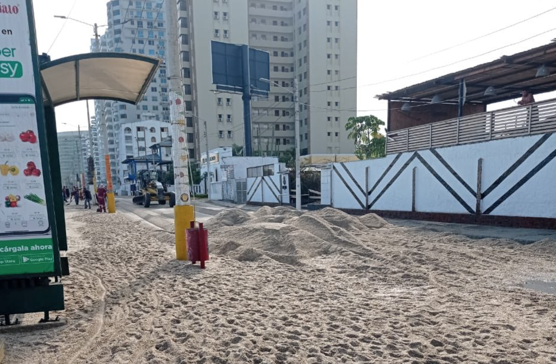 Las autoridades cerraron el paso vehicular en la calle del malecón de Salinas como medida de precaución mientras que maquinaria y personal han trabajado estos días para remover la gran cantidad de arena que ha traído el agua.