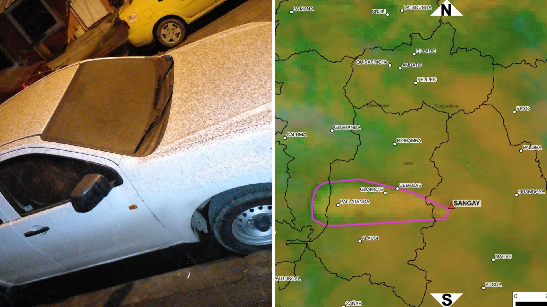 Actualización | Realizado el barrido de información con corte 08h30, existe caída de ceniza del volcán #Sangay en:
