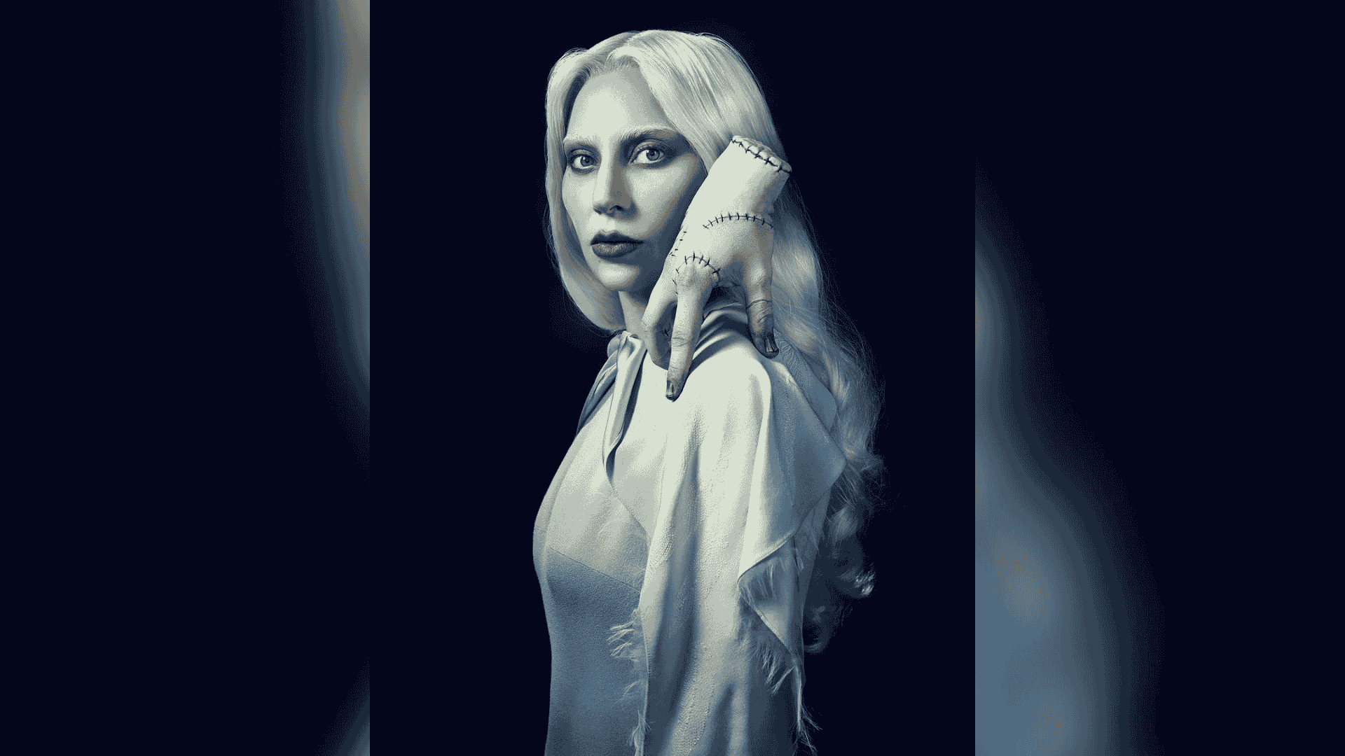 La imagen muestra a Gaga con un estilismo fantasmal en tonos blancos, una mirada penetrante y piel pálida, acompañada por la icónica mano «Cosa».