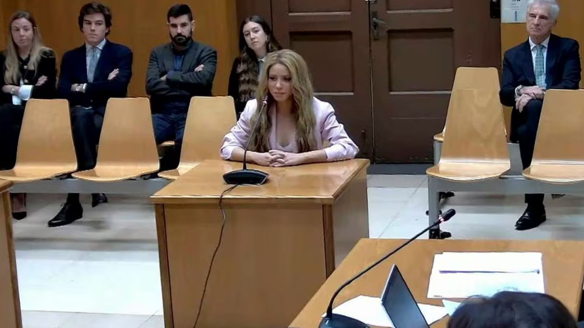 Shakira llegó acompañada de sus abogados y de varios agentes de Policía. Vestía un traje de chaqueta y pantalón color rosado y tapaba sus ojos con gafas de sol.