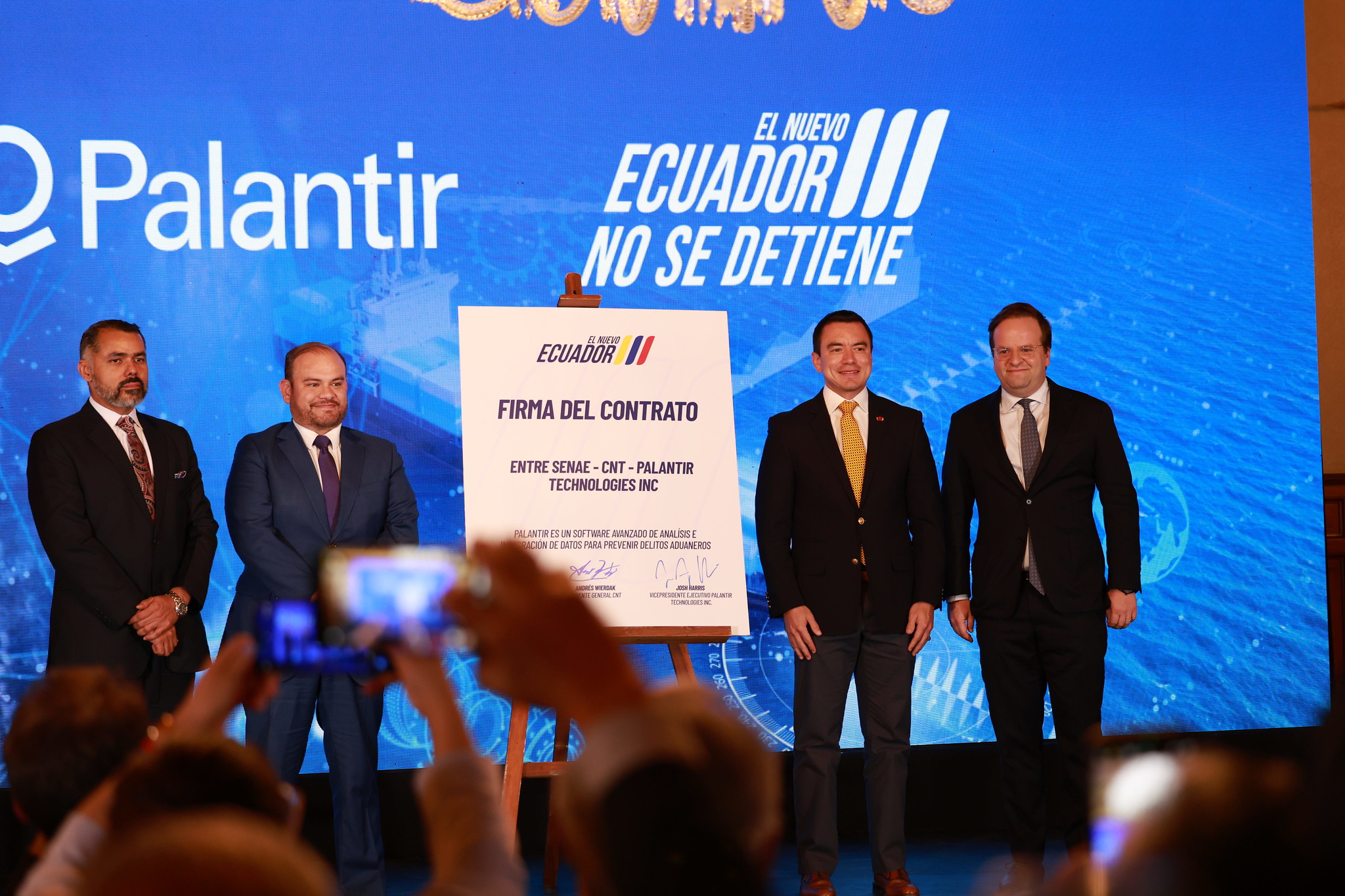 El evento incluyó la firma de un contrato entre el Servicio Nacional de Aduana del Ecuador (SENAE), la Corporación Nacional de Telecomunicaciones (CNT) y Palantir, como parte de la estrategia de transformación digital del Estado.