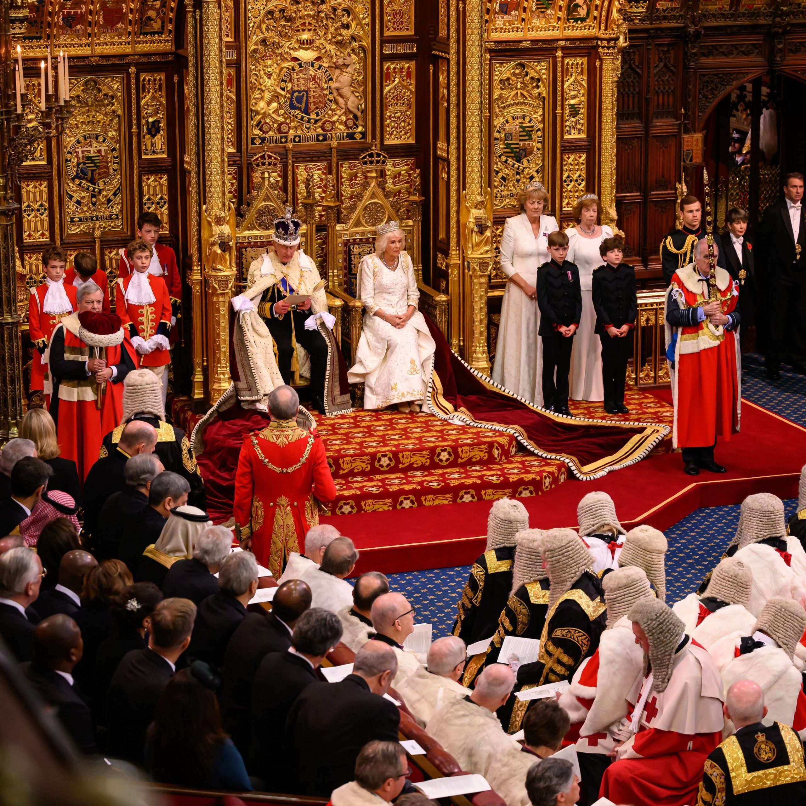 Con la corona imperial sobre su cabeza e instalado en el trono de oro de la Cámara de los Lores, junto a la reina Camila, sentada a su izquierda, el rey pronunció el discurso de diez minutos.