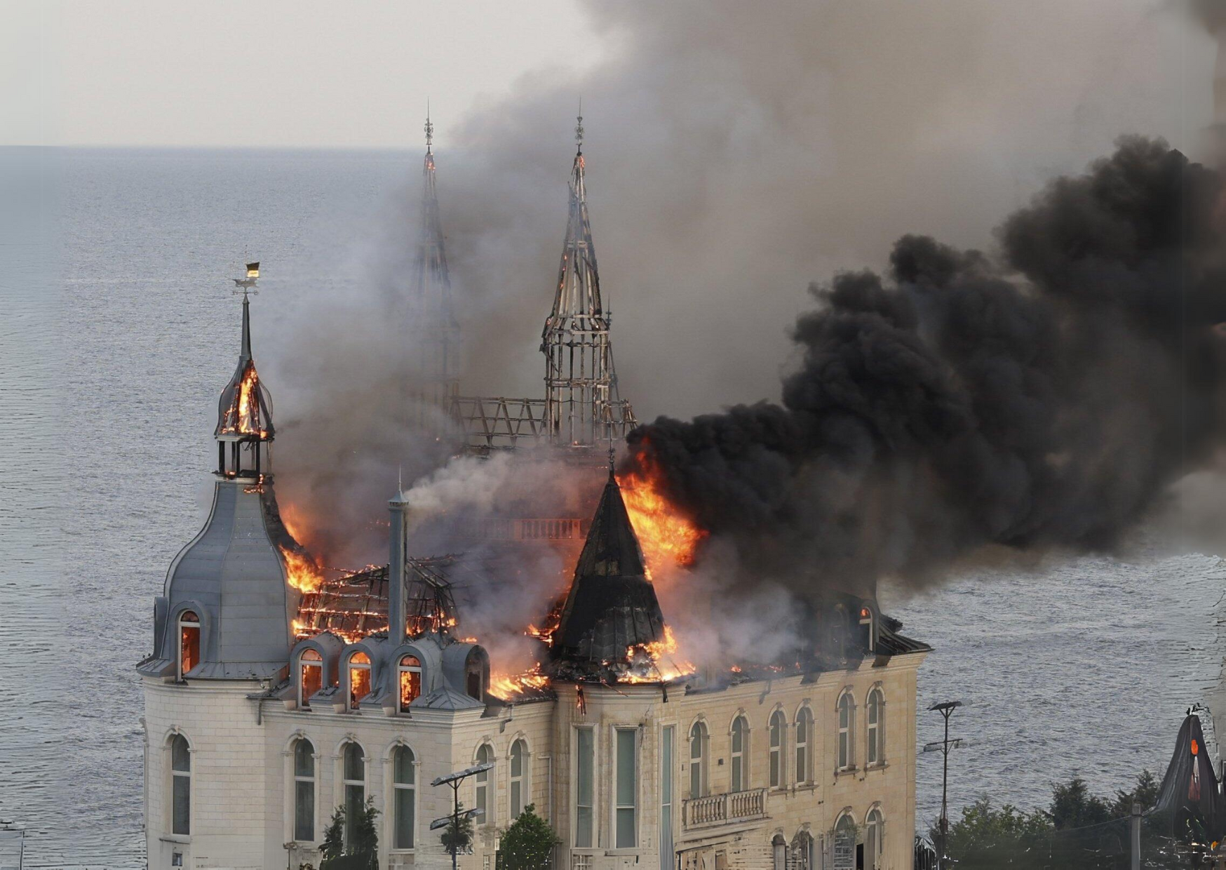 El conocido como ‘castillo de Harry Potter’ en Odesa, Ucrania, famoso por sus impresionantes torres, ha sufrido un devastador incendio tras un ataque que resultó en la muerte de al menos cinco individuos y dejó a más de 30 heridos, algunos de ellos en estado crítico.