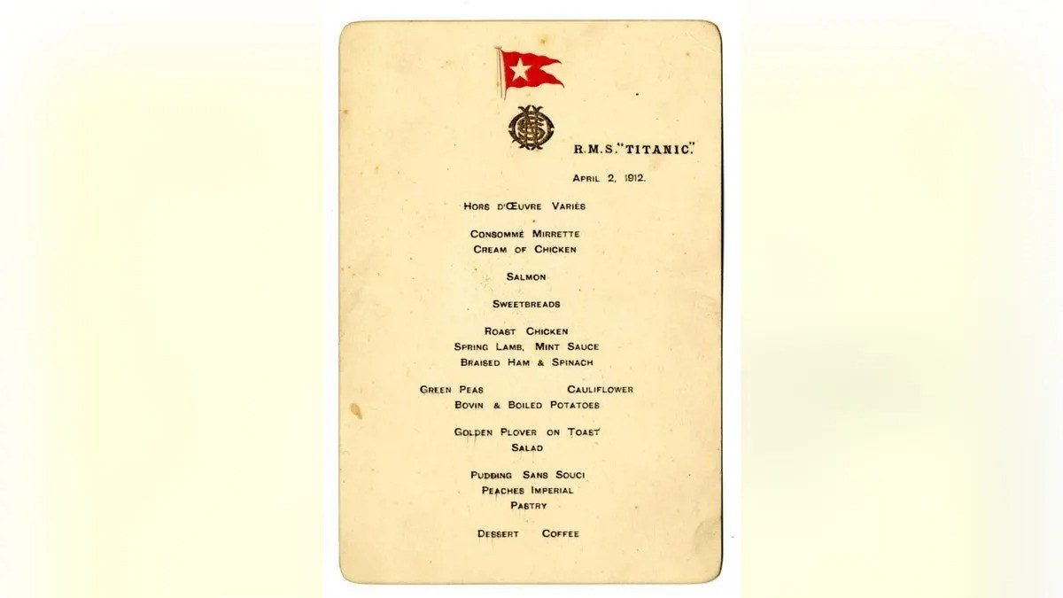 El ejemplar del menú, estimado entre 50.000 y 70.000 libras esterlinas (61.000 y 84.000 dólares), presenta los platos que fueron servidos durante la cena -entre ellos ostras, cordero en salsa de menta y pato en salsa de vino- servida la noche del 11 de abril, poco después que el buque zarpara.