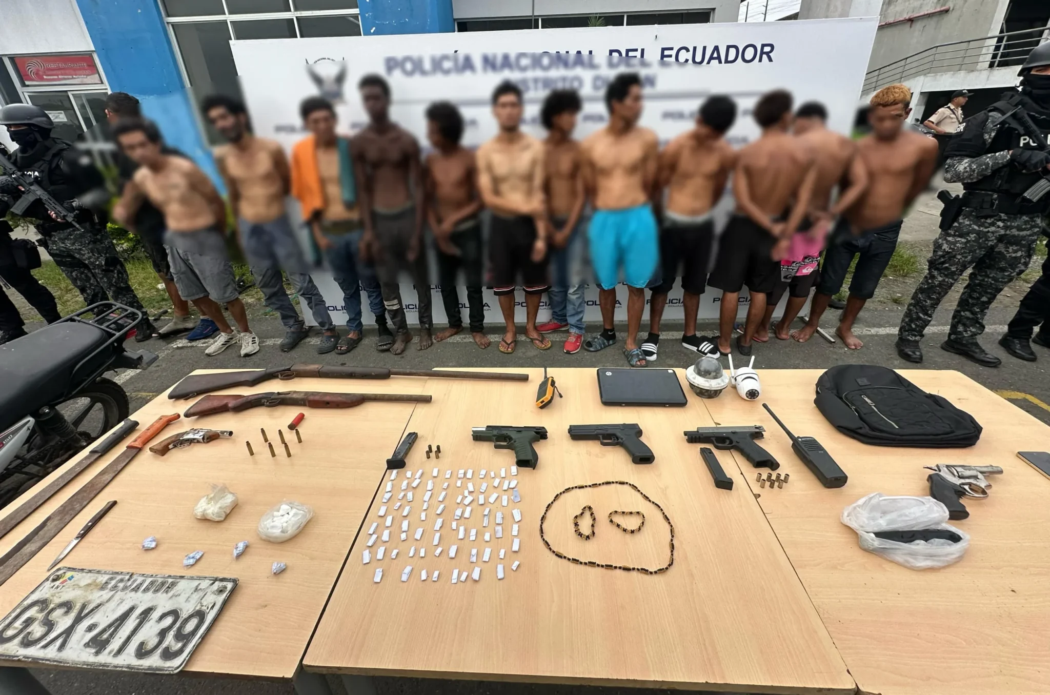 El operativo dejó como resultado 13 personas aprehendidas, entre ellas cuatro con antecedentes penales por delitos como asesinato, tráfico de sustancias ilícitas y robo. También fueron detenidos dos menores de edad, quienes ya se encuentran aislados. Durante la intervención se decomisaron seis armas de fuego, cinco cartuchos, radios de comunicación, cámaras de videovigilancia y se retuvieron nueve motocicletas.