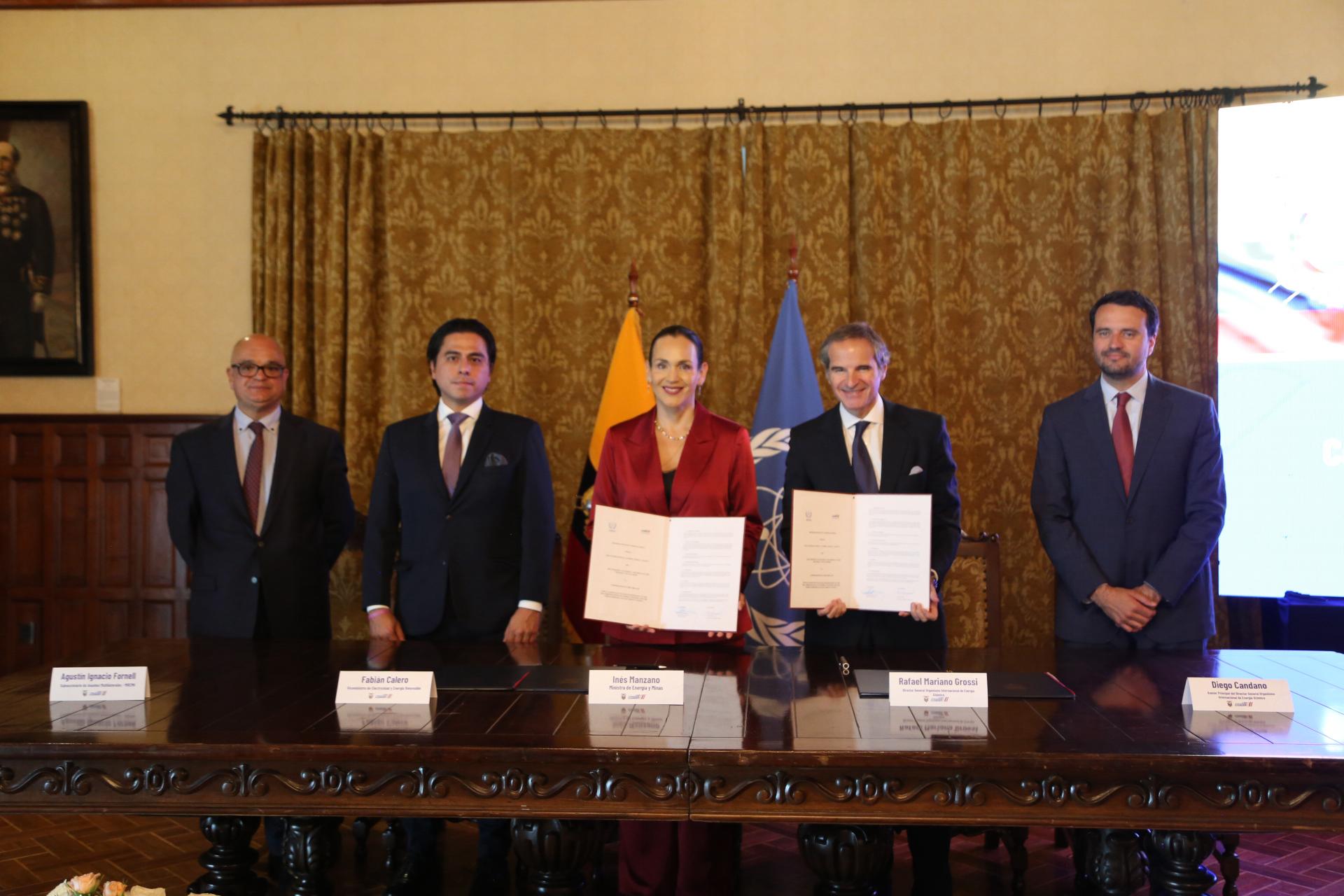 El acuerdo fue firmado este 13 de mayo de 2025 por la ministra de Energía y Minas, Inés Manzano, y el director general del OIEA, Rafael Mariano Grossi, durante una reunión bilateral realizada en el Palacio de Carondelet, en el marco de la visita oficial de la delegación del organismo internacional al país. También participó el viceministro de Electricidad y Energía Renovable, Fabián Calero.