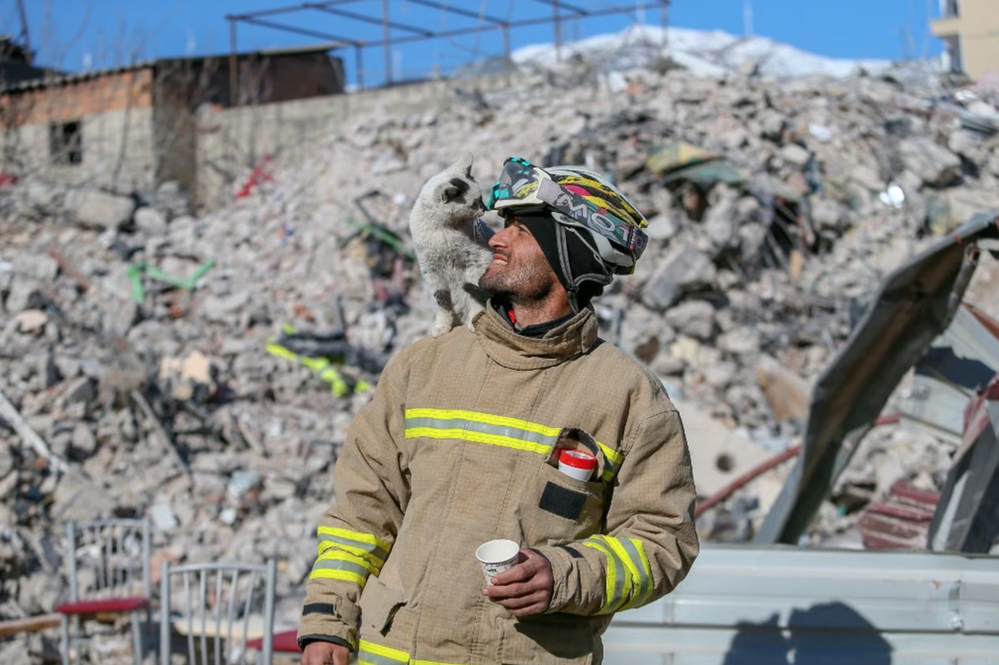 El pasado 15 de febrero, Ali Cakas, integrante del equipo de ciclismo nacional de Turquía, rescató a «Enkaz», un gatito de pelo blanco. El hombre logró salvar al felino durante las tareas de rescate.