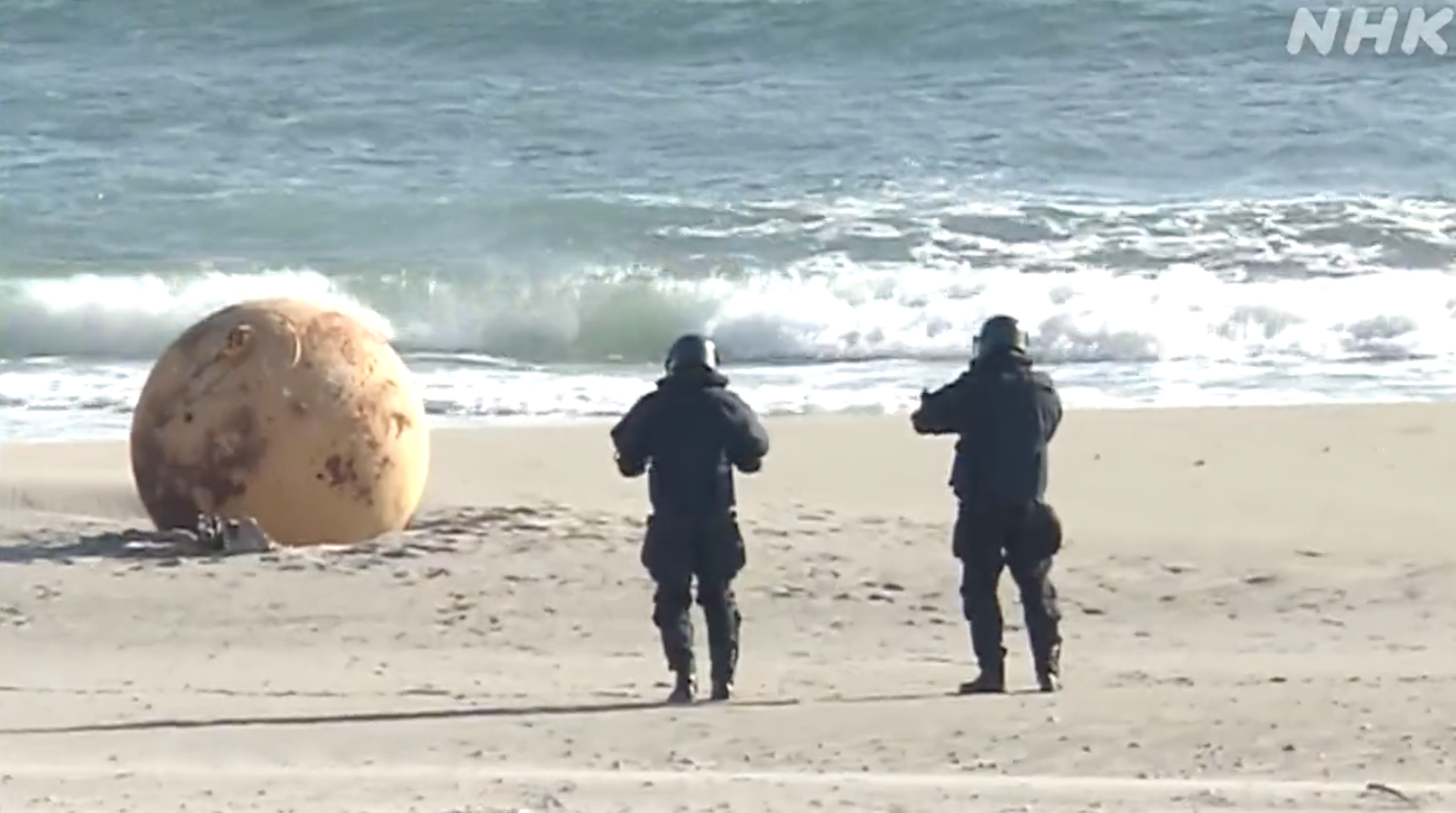 Por su color marrón parduzco y, sobre todo, por los dos enganches que tiene en cada lado llevaron a pensar que se trataba de una mina, pero la sorpresa de que estuviera hueca mantienen la incógnita sobre esta esfera. La guardia costera japonesa no oculta su desconcierto: «No podemos determinar qué es y guardamos todo tipo de cautelas», admitieron en declaraciones al canal NHK.