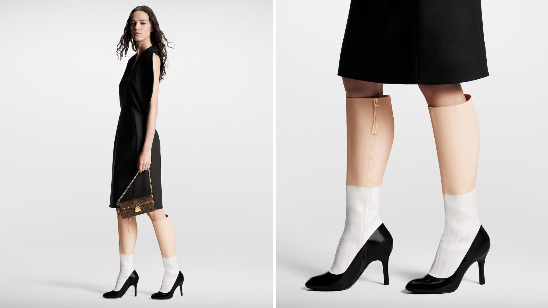 Las botas son altas, dan justo debajo de la rodilla y simulan el diseño de unos zapatos de punta negros con medias blancas integrados con el logo LV. Pero lo que verdaderamente está causando revuelo es que del tobillo para arriba son color piel, simulando unas piernas, y en los laterales tienen un cierre para que sean fáciles de ponerse.
