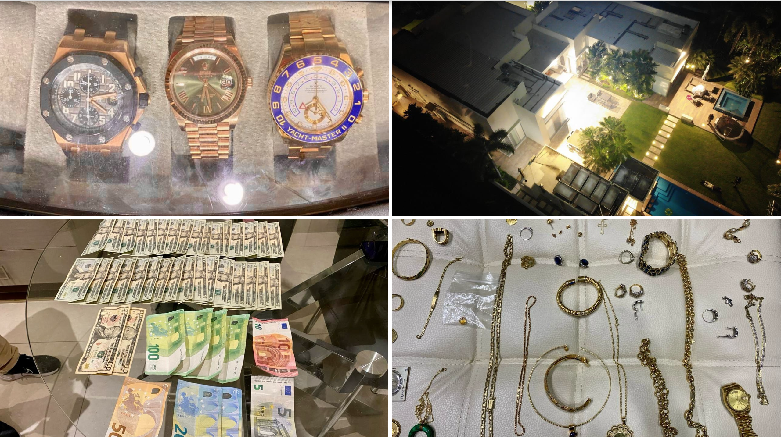 Dentro de esta casa las autoridades confiscaron dos armas de fuego, teléfonos celulares, licores, documentos, chequeras, USD 7.535 , 505 euros, joyas y tres relojes de la marca Rolex.