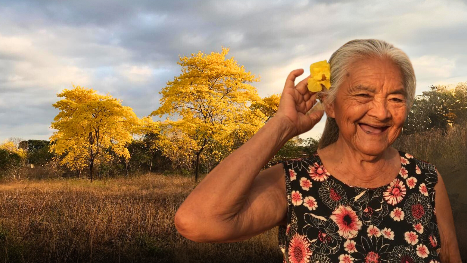 Desde que tiene memoria, Ilda recuerda que cada año en sus terrenos florecen estos árboles y con alegría agarra y se coloca las flores en su cabeza.