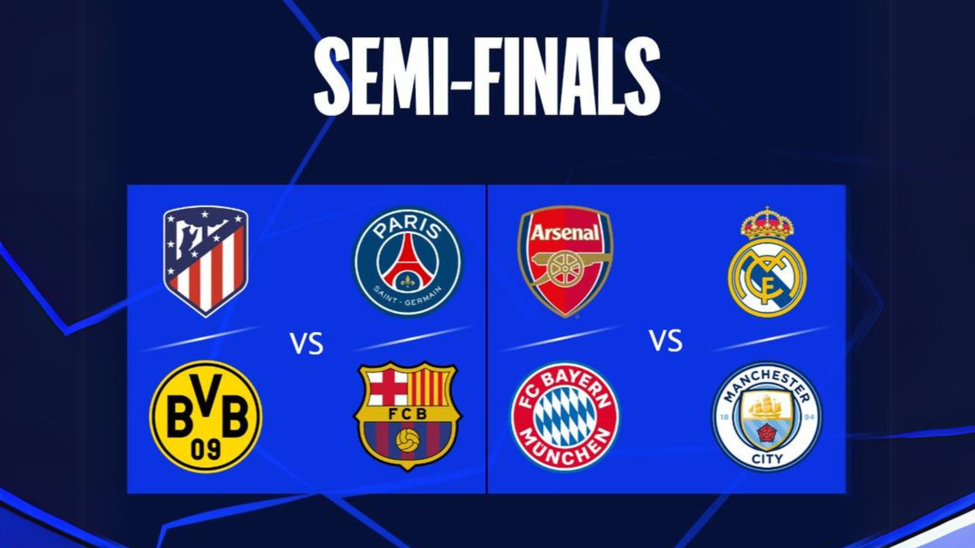 Los partidos de ida el 9 y 10 de abril y los de vuelta, el 16 y 17 el mismo mes. Las semifinales están programadas para el 30 de abril y 1 de mayo (partidos de ida) y ara el 7 y 8 de mayo (partidos de vuelta). La final se jugará el 1 de junio en el incomparable escenario de Wembley, en Londres.